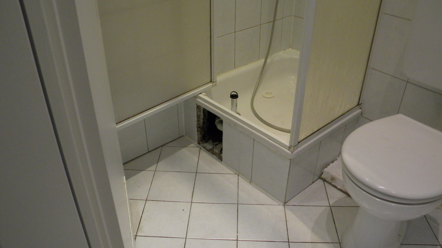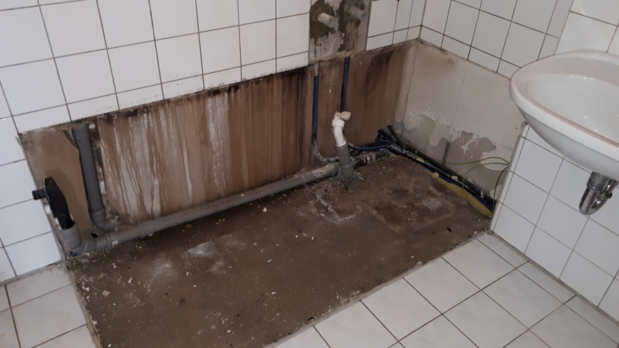 Hier wurde direkt die komplette Badewann herusgetrennt, dabei wurden dann auch noch Fliesen beschädigt. Ursache des Wasserschadens war lediglich eine schadhafte Silikonfuge. Im Bild darunter war ein identisches Schadenbild durch eine schadhafte Silikonfuge, hier wurde jedoch eine Fliese entfernt anstatt alles rückzubauen. Durch diese Öffnung konnte dann ordentlich getrocknet werden! Nach dem die Silikonfuge erneuert wurde konnte während der Trocknung die Dusche genutzt werden. Die Bewohner im oberen Bildbeispiel hatten für Neun Wochen keine Badewanne zum baden/duschen und außerdem Schutt und Dreck.